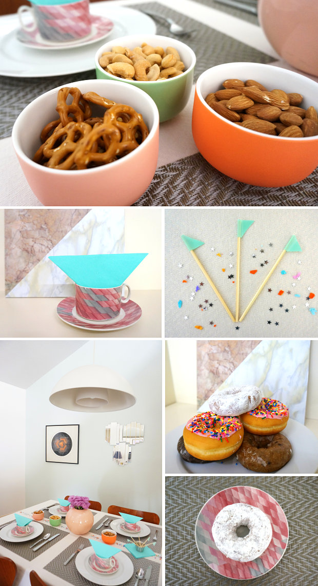 For our spring Retro Foodie shoot, we present a Pastel Party featuring coffee, donuts, confetti, sprinkles and loads of geometry! While this ’80s-style party concept would be ideal for a weekend brunch, we enjoyed the goodies as an afternoon snack. Nothing like beating the mid-day slump with a little caffeine and sugar. Read on for all the sweet details…