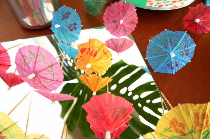A reflection of a large monstera leaf can be seen in the mirrored tile on the table below. Make sure the surface of the tile (or tabletop) is clean, then cover it with drink umbrellas. Invite guests to take an umbrella for their beverage of choice as they arrive.