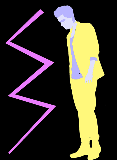 The paintings below have a pop art effect when placed side by side, and their Florida coast color scheme and designer suits are stylish ’80s references: